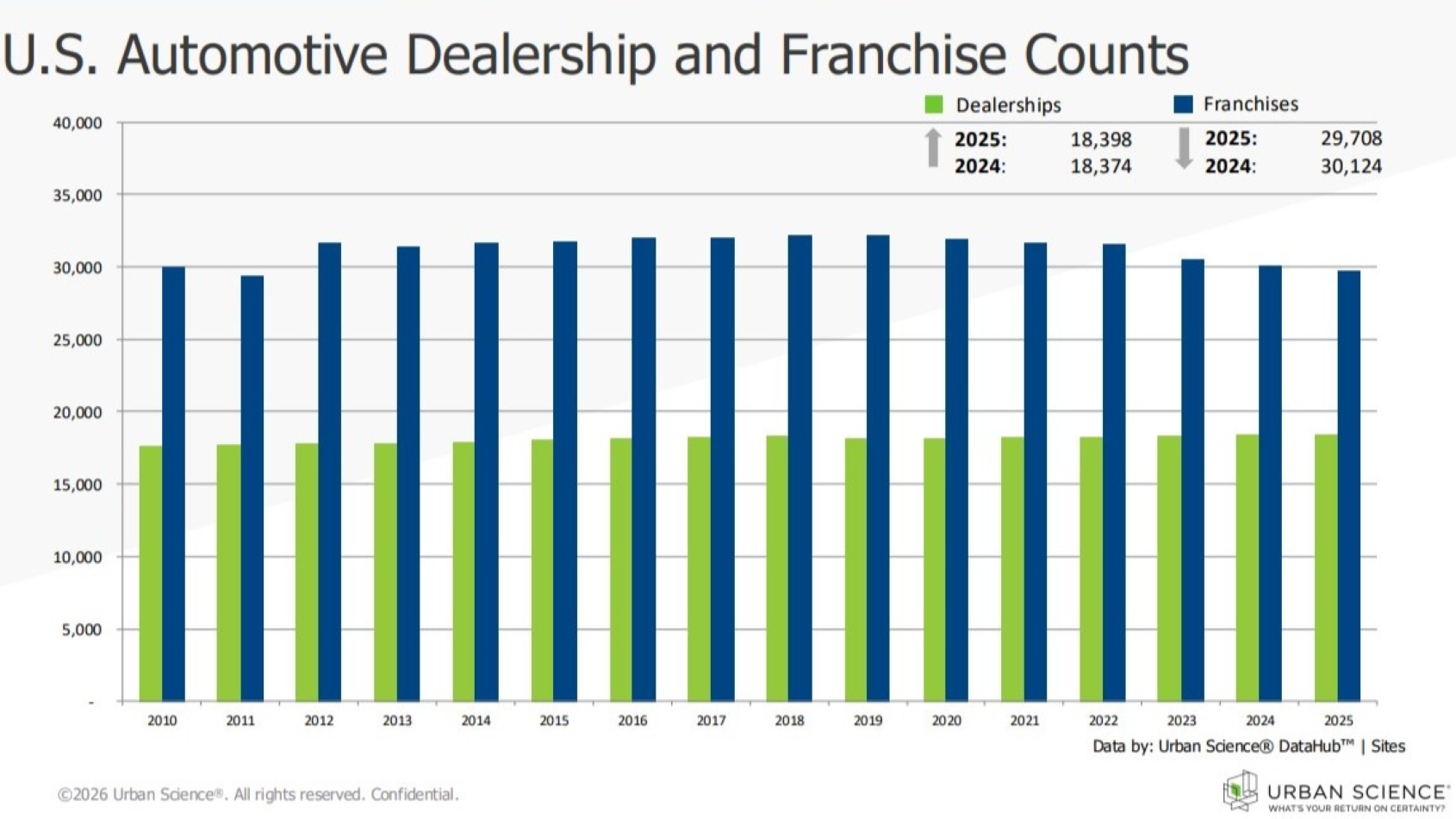In its 2025 Year-End Automotive Franchise Activity Report, Urban Science reported the number of franchise stores was up last year, but by just 24 rooftops, rising to 18,398 from 18,374 in 2024.