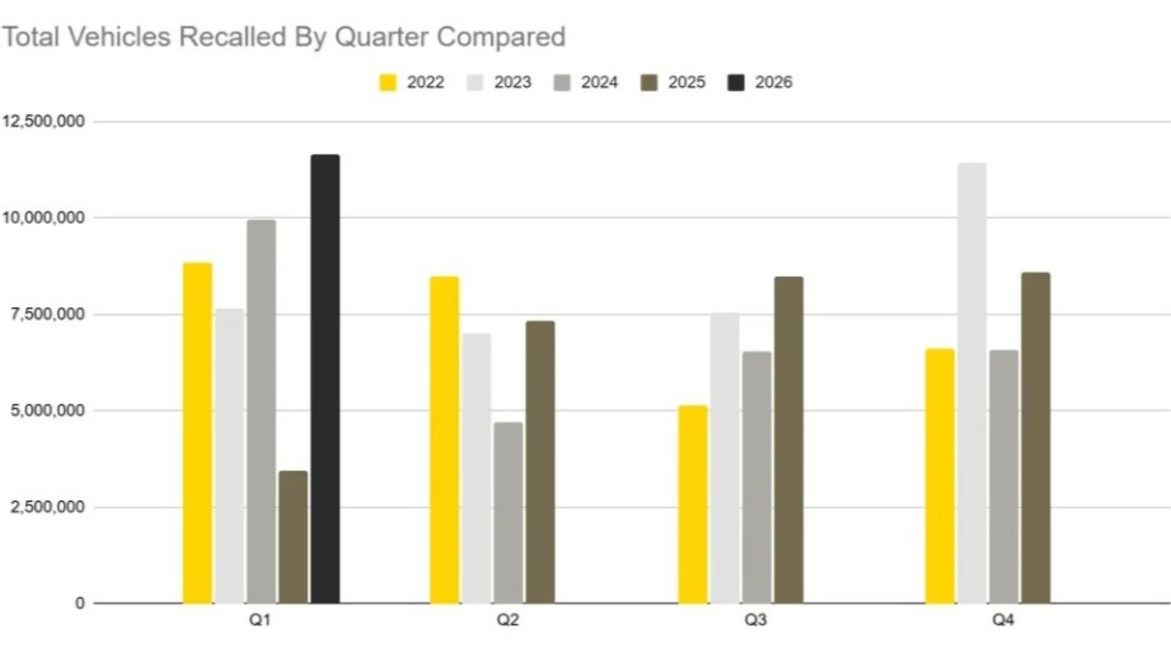 According to BizzyCar’s Q1 2026 Recall Report, 11.6 million vehicles were recalled in the U.S. during the quarter, the most of any quarter since the company began keeping records in 2022.