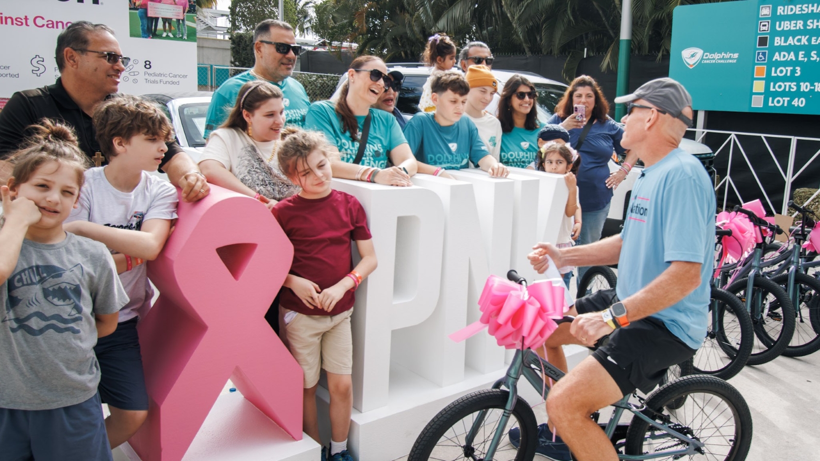 AutoNation executive vice president and chief financial officer Thomas Szlosek shows off a bicycle built by AutoNation employees to young cancer patients and their families. AutoNation donated 20 of the bikes during the Dolphins Cancer Challenge DCC XVI event in Miami Gardens, Fla. Photo by Marvin Cruz Photography.