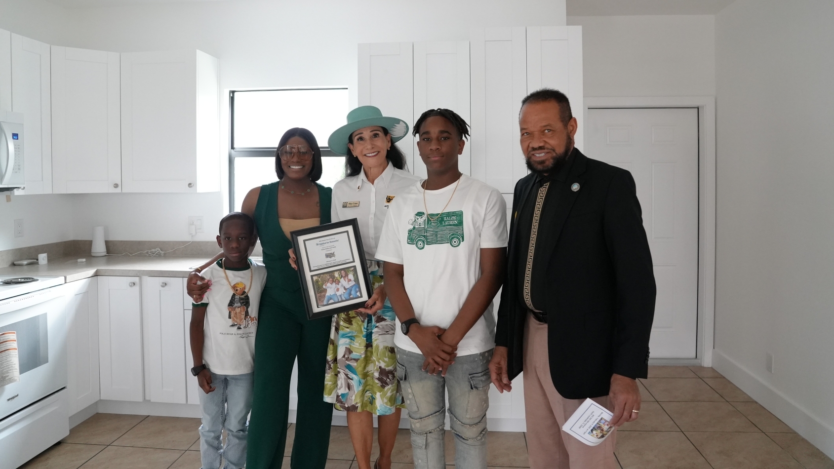 Case and North Lauderdale Mayor Samson Borgelin joined new homeowner Portia McKay and her sons, Alfredo and Jayden, to celebrate the new home Case sponsored.
