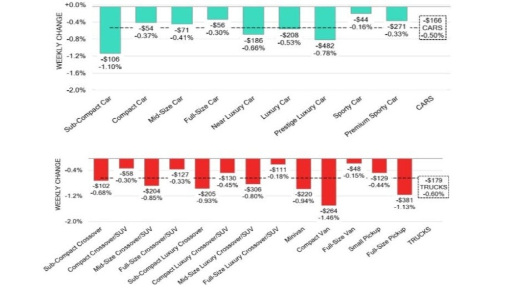 Just as the previous week, all 22 vehicle segments lost value, and 16 of them were down by more than $100. That even includes subcompact cars, which dropped $106 and was among three segments posting a decrease of more than 1% — the others were compact vans (1.46%, $264) and prestige luxury cars (0.78%), which had the largest dollar fall at $482.