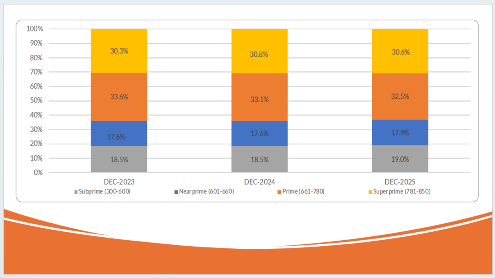 From December 2023 to December of last year, analysts reported the share of consumers in the VantageScore subprime credit tier increased from 18.5% to 19.0%, while the VantageScore near-prime segment edged up from 17.6% to 17.9%.